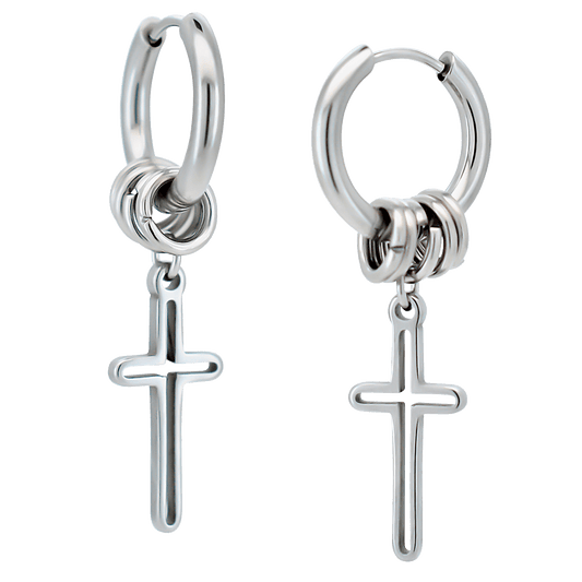 Hypoallergenic 316L Stainless Steel Huggies with 5 Rings & Dangling Cross – Steel Clip-On Earrings