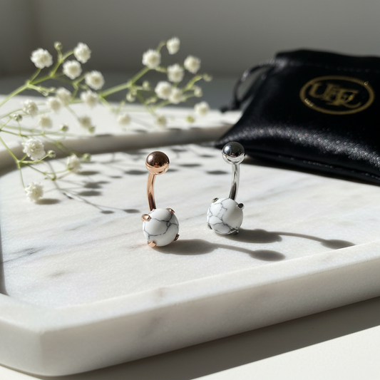 Regular price $3.40 USDRegular priceUnit price / perSale price $3.40 USD316L Surgical Steel Prong Set Howlite Resemble Stone Belly Navel Ring Steel Color - 8x5mm Ball - 14g Thickness - 11mm Length