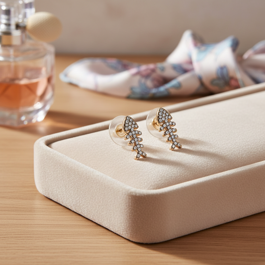 Brass Fishbone Stud Earrings – Gold Finish with Crystal Shine