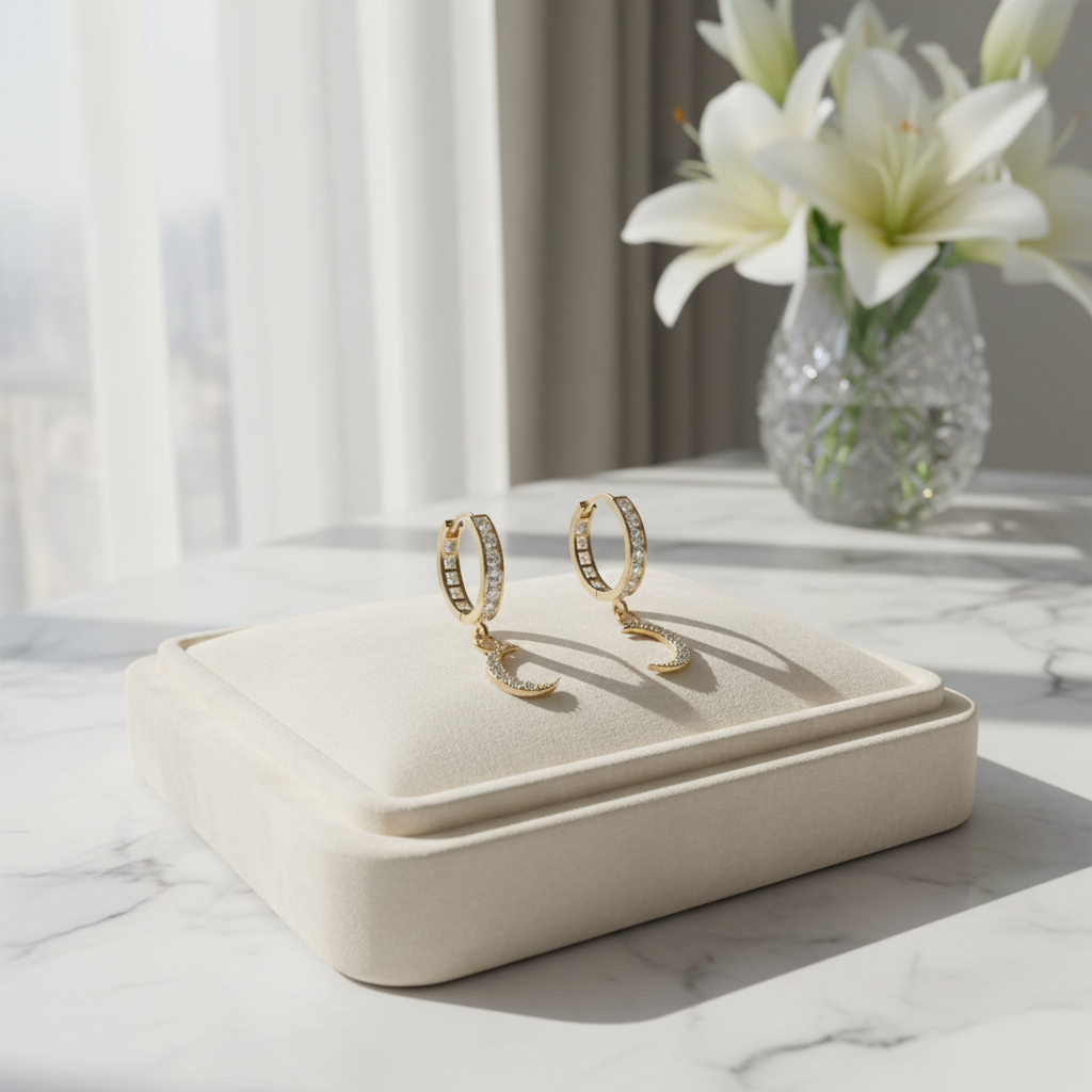 Design: Dangling crescent moon with shimmering CZ stones for added sparkle