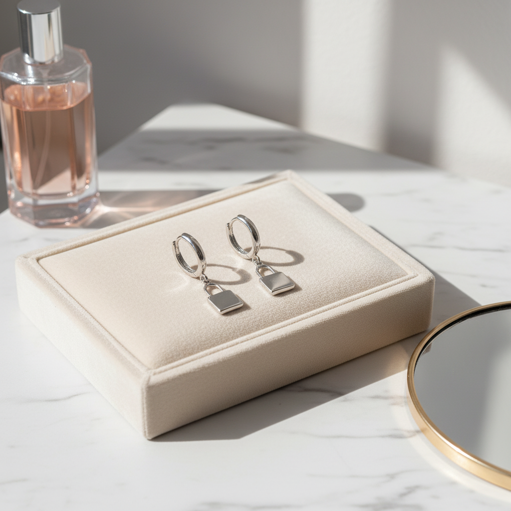 Crafted on a resilient stainless steel base, these huggies are plated in radiant 14K gold and adorned with a delicate lock charm—symbolizing protection, intimacy, and the secrets we choose to keep close. Lightweight yet statement-making, they hug the lobe with quiet strength and shimmer. Hypoallergenic, tarnish-resistant, and designed to last—just like the stories they carry.