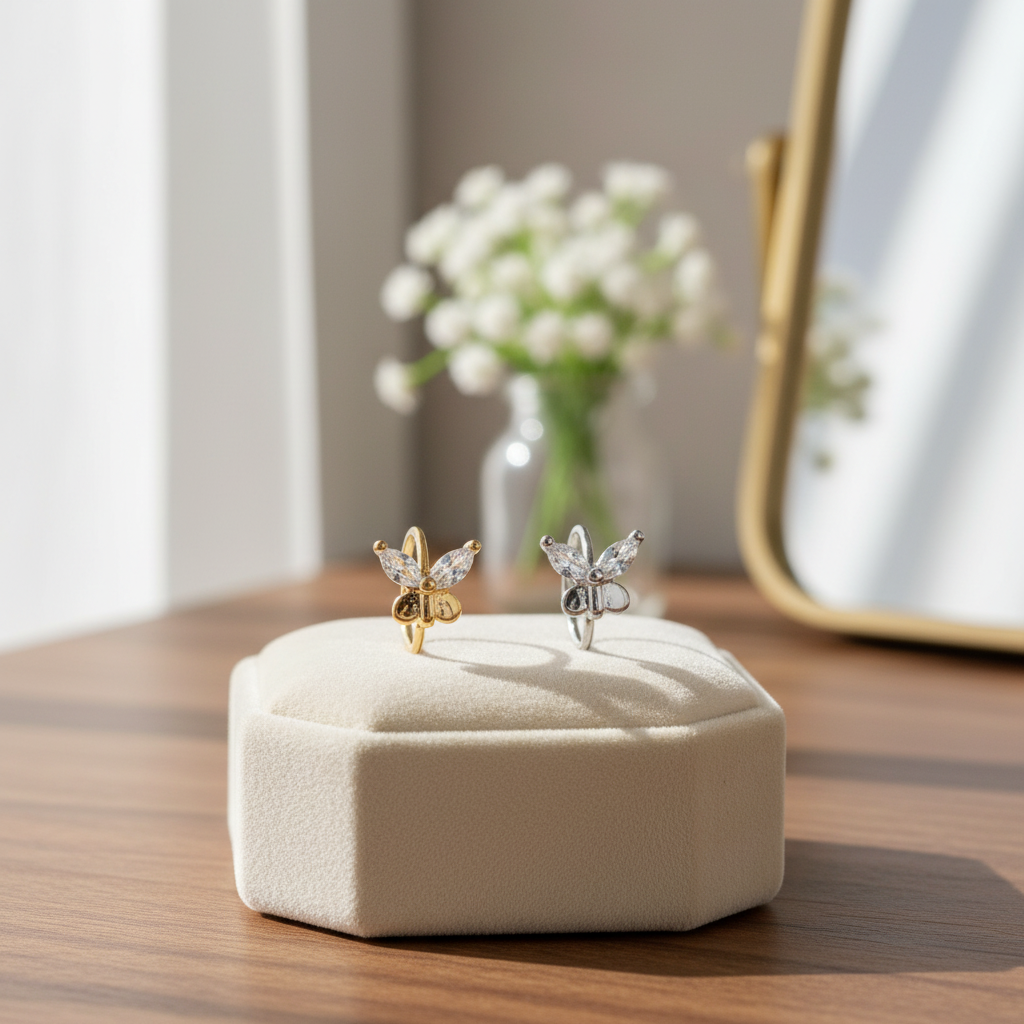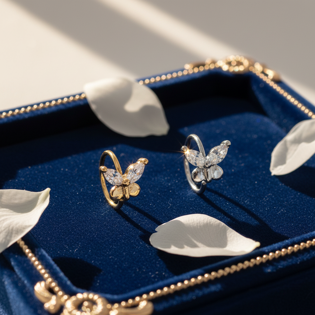 Delicate yet durable, this butterfly hoop piercing is crafted from premium 316L surgical steel for long-lasting shine and hypoallergenic comfort. With a sleek 8mm/10mm diameter and ultra-light 22G thickness, it’s perfect for nose piercings or cartilage placements like the helix, tragus, or lobe.