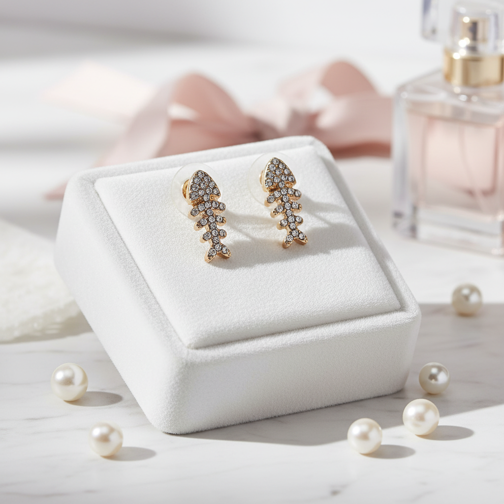 A shimmer of rebellion, a whisper of elegance. These fishbone stud earrings fuse oceanic edge with refined sparkle, crafted in lead-free brass and finished in radiant gold. Each vertebra gleams with crystal rhinestones, catching light like secrets shared in confidence. Lightweight yet bold, they’re designed for everyday empowerment—whether you're making waves or standing your ground.